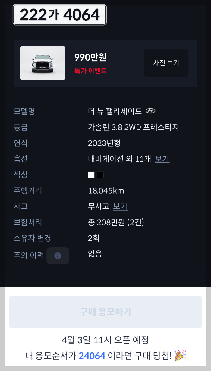 해당 차량상세페이지에는 '구매응모하기' 버튼 아래에